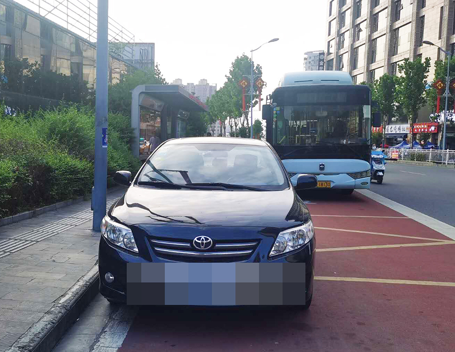 在金州廣場(chǎng)南站,十幾輛私家車“整齊劃一”的停在公交車站位置,地面紅色區(qū)域上的公交兩字也被完全覆蓋,從遠(yuǎn)處望去,站牌旁坐著幾個(gè)人正等待公交車的到來(lái)。在興華名城站,一輛私家車??吭诠卉囌厩?,駛來(lái)的公交車無(wú)法按其規(guī)定進(jìn)站停車。在西城閣站和漢城國(guó)際西站,幾輛私家車甚是“任性”,儼然將公交車站當(dāng)成了“停車場(chǎng)”,筆者在此駐足十幾分鐘,它們依然“紋絲不動(dòng)”,有的車上甚至沒(méi)有車主。
