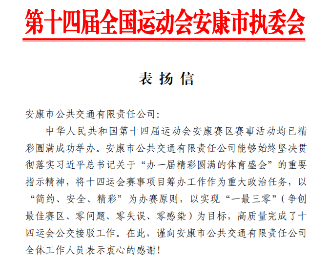 近日,第十四屆全國(guó)運(yùn)動(dòng)會(huì)安康市執(zhí)委會(huì)向市公交公司發(fā)來(lái)表?yè)P(yáng)信,對(duì)公交公司高質(zhì)量完成十四運(yùn)會(huì)公交接駁工作表示感謝。